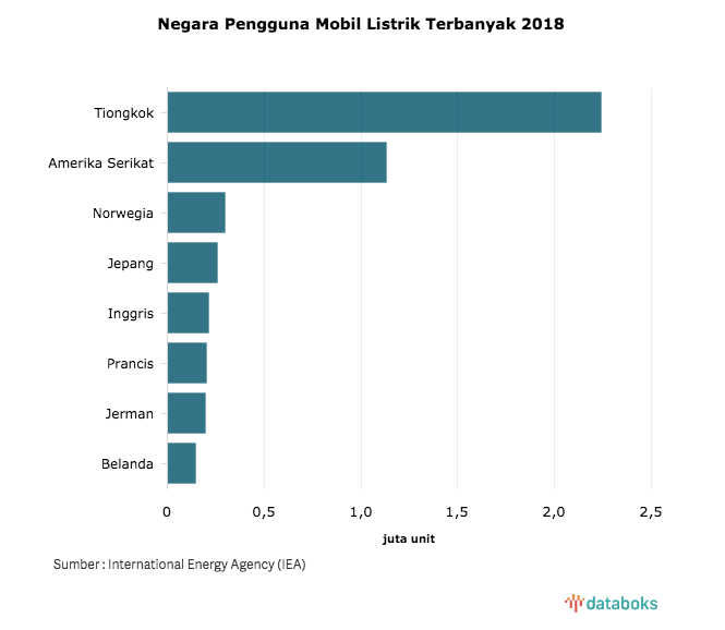 Menurut International Energy Agency (IEA), penggunaan mobil listrik di Jepang berada di urutan ke empat di dunia di bawah Tiongkok, Amerika Serikat (AS), dan Norwegia, pada 2018. Padahal Jepang merupakan rumah dari beberapa pabrikan otomotif terbesar di dunia seperti Toyota, Honda, Mitsubishi, dan sebagainya. Simak databoks berikut :