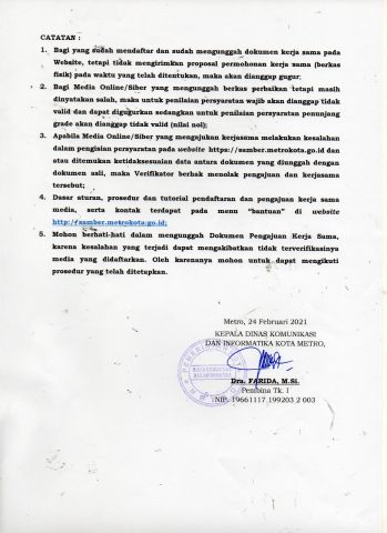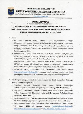Informasi Perpanjangan Waktu Verifikasi Kerja Sama Media Online/Siber dengan Pemkot Metro T.A 2021
