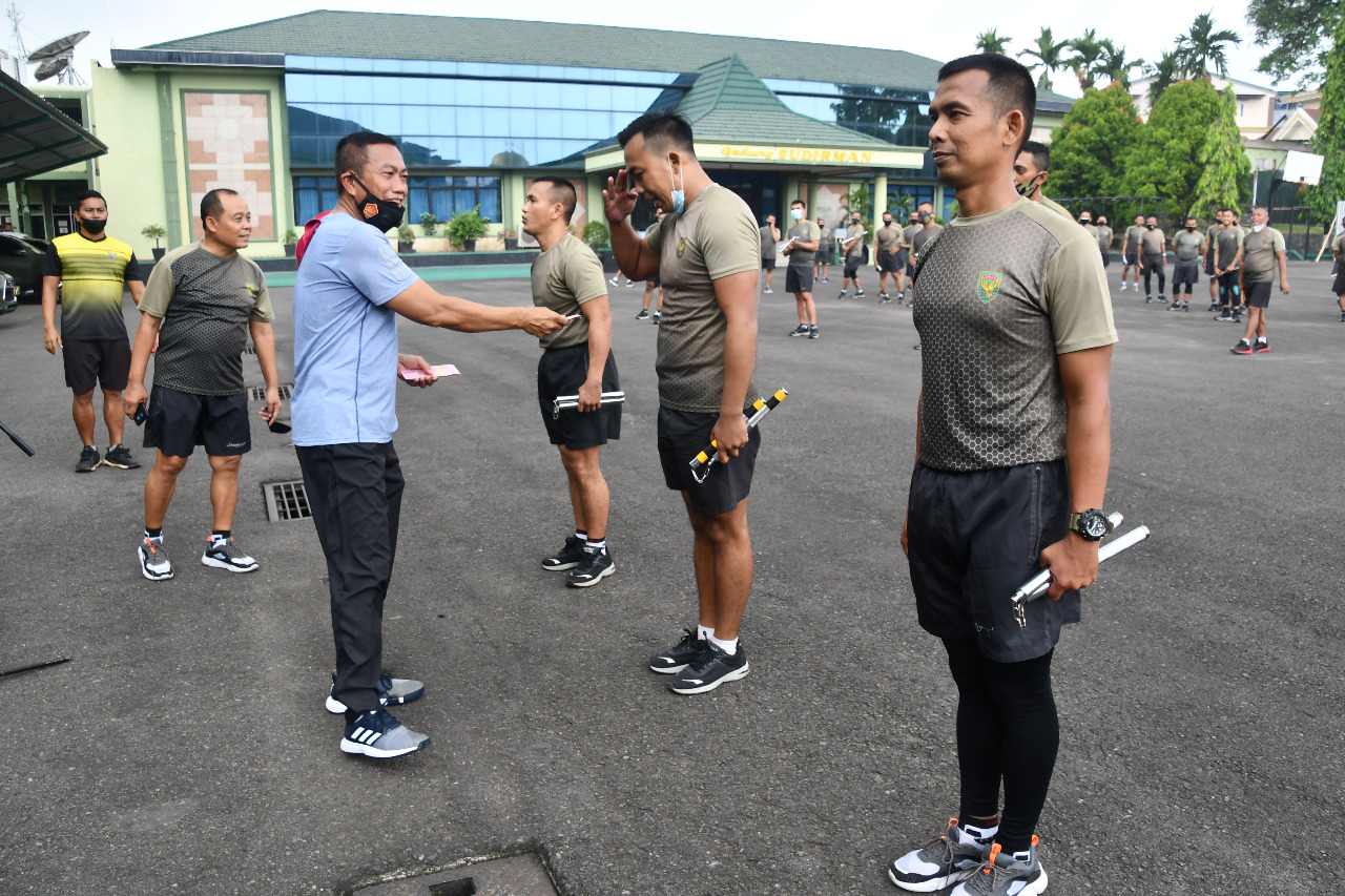 Palembang, A1BOS.COM - Usai melaksanakan olahraga rutin lari jalan, segenap Prajurit Kodam II/Sriwijaya, melaksanakan latihan cabang olahraga ela diri double stick, bertempat di Lapangan Apel Makodam II/Swj Jln. Jenderal Sudirman KM. 2,5 Palembang, Jumat (30/04/2021).