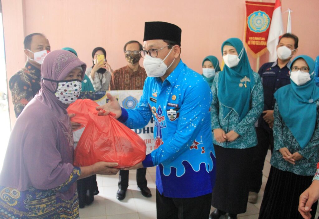 Kota Metro, A1BOS.COM - TP-PKK Kota Metro lakukan pembagian sembako secara simbolis bagi kaum Dhuafa se-Kota Metro, di Aula Kelurahan Rejomulyo Metro Selatan, Kamis (06/05/2021).